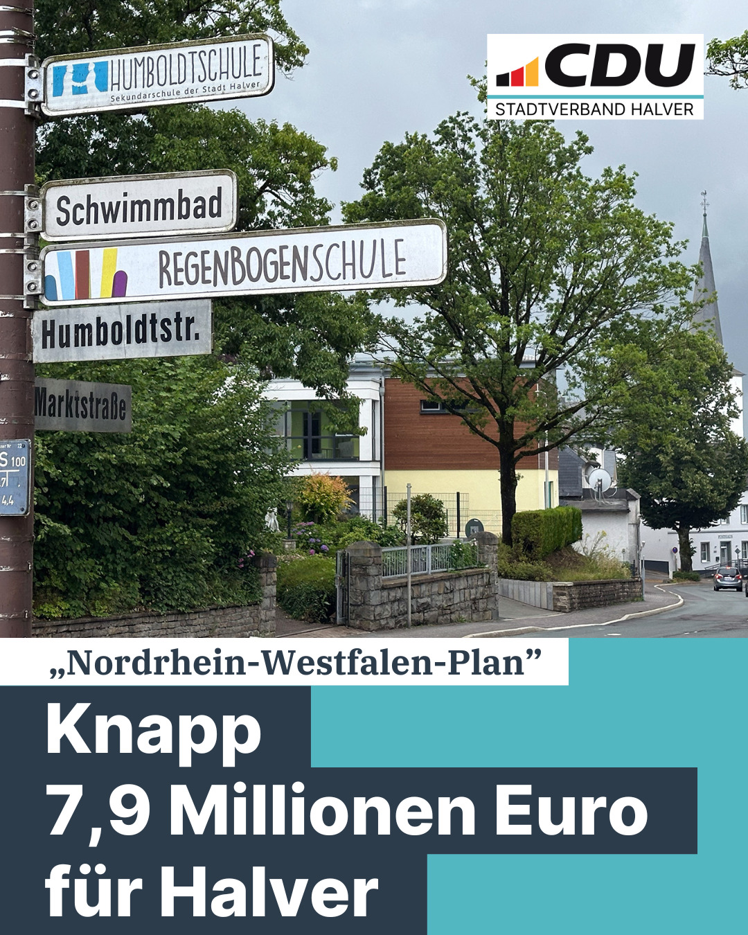 HALVER - Die CDU-geführten Landesregierung stellt über den „Nordrhein-Westfalen-Plan für gute Infrastruktur“ insgesamt 227 Mio. Euro für den Märkischen Kreis bereit – und Halver erhält davon stolze 7.857.288,78 Euro! Als CDU Halver freuen wir uns über diese gezielte Unterstützung für unsere Stadt. Ob Kitas, Schulen, Straßen oder Digitalisierung: Wir setzen uns dafür ein, dass diese Mittel nachhaltig und sinnvoll eingesetzt werden – für ein modernes, lebenswertes Halver.