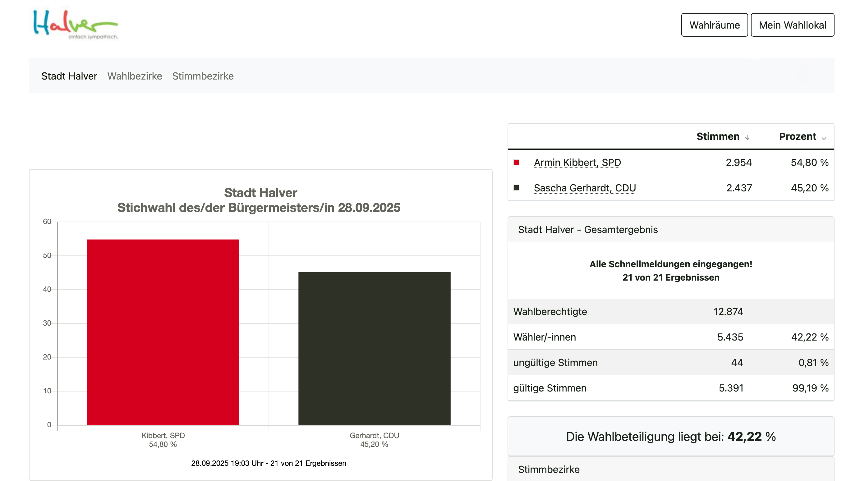 HALVER – Mit 54,8 % der Stimmen setzte sich Armin Kibbert (SPD) in der Stichwahl am 28. September gegen unseren Kandidaten Sascha Gerhardt durch, der 45,2 % erreichte. Als faire Verlierer gratulieren wir Armin Kibbert zum Wahlsieg und wünschen ihm für die verantwortungsvolle Aufgabe in unserer Heimatstadt alles Gute.